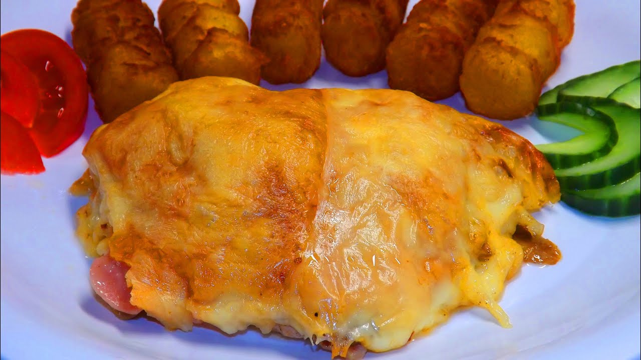 natúr csirkemell, sonkával, gombával, sajttal sütve