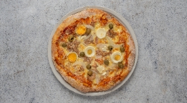 pizzaszósz, tonhal, főtt tojás, olivabogyó, sajt